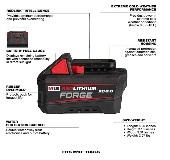 - Comprend : 1 batterie M18 FUELMC REDLITHIUMMC FORGEMC XC6.0
