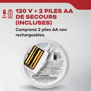 Le détecteur de fumée Kidde combine alimentation 120V et batterie de secours afin d’assurer une protection constante. Même lors d’une panne d’électricité de courte durée, l’appareil continue de fonctionner grâce à ses deux piles AA non rechargeables.